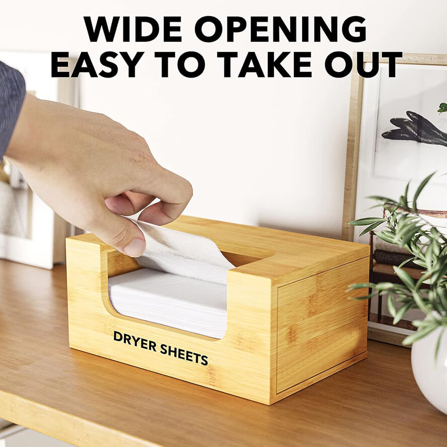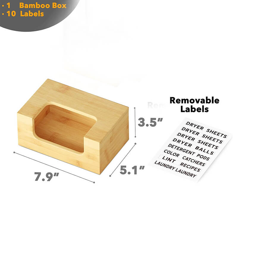 Name and description: | Bamboo Laundry Softener Dryer Sheets Holder with Opening and Labels for Home Laundry Room Farmhouse Decor Donghe DHH240003 |