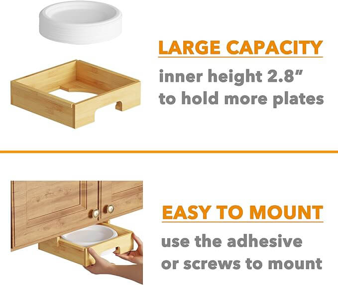 Name and description: | 10-inch Paper Plate Dispenser Bamboo Under Cabinet Bamboo Plates Holder Kitchen Counter Vertical Plate Dipensers Holders Countertop Caddy for 10 inches Plates Bamboo Donghe DHK246006 |