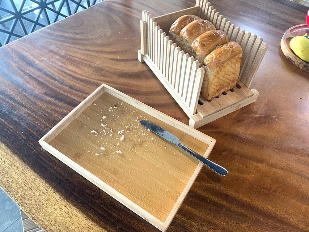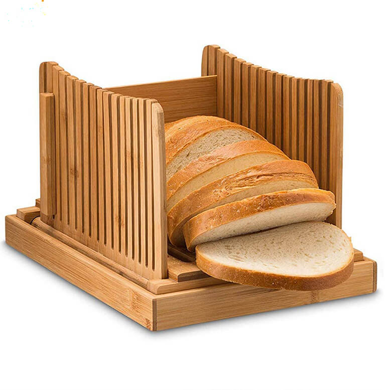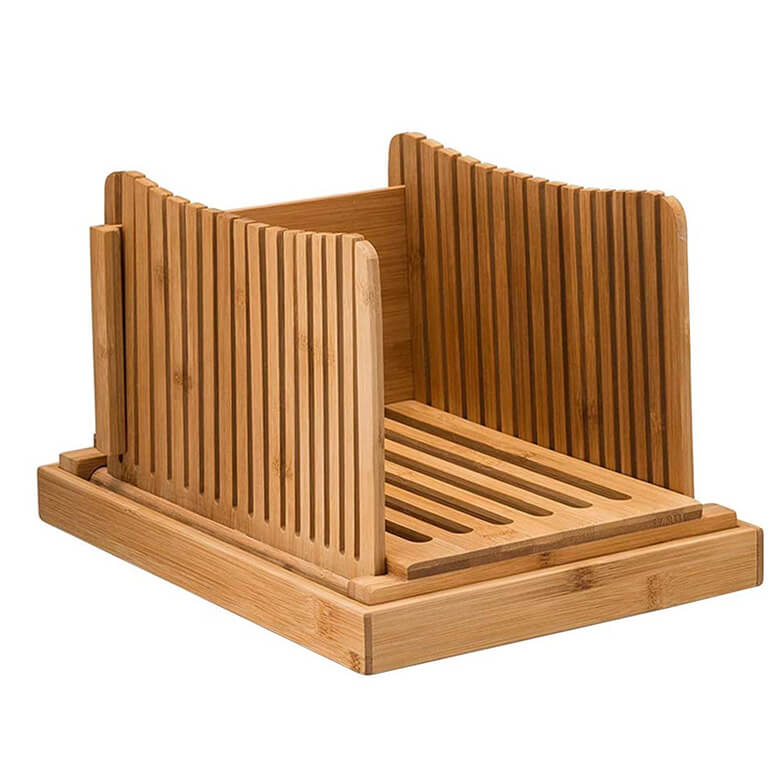 Name and description: | Bamboo Wood Foldable Bread Slicer Compact Bread Slicing Guide with Crumb Catcher Tray for Homemade Bread Thickness Adjustable Donghe DHK01004 |