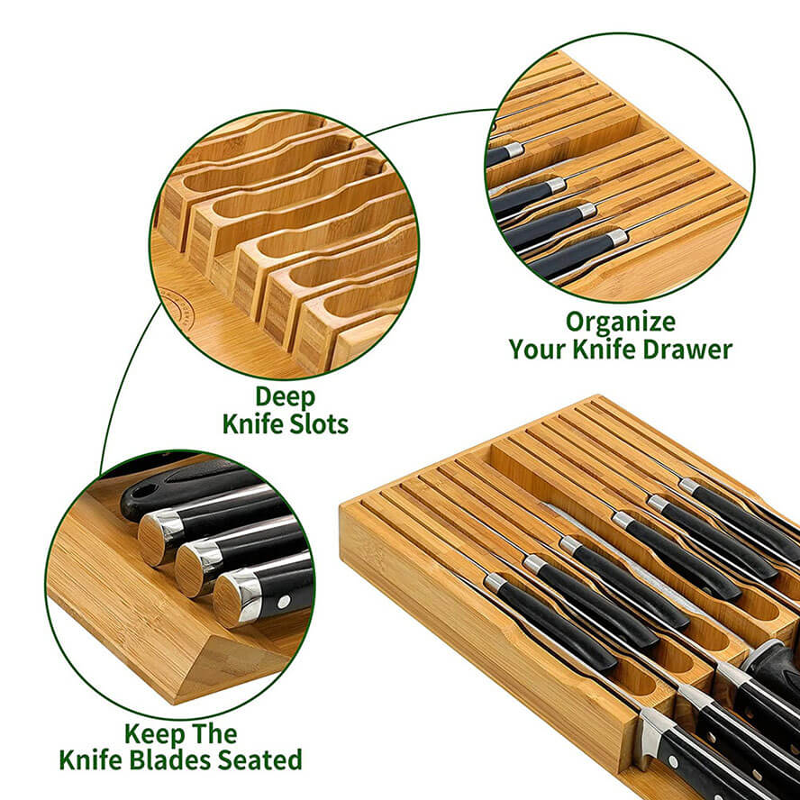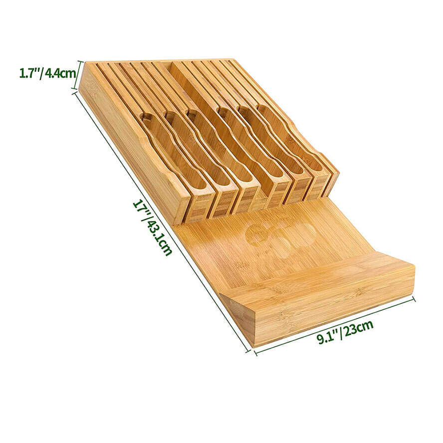 Name and description: | In-Drawer Bamboo Knife Drawer Organizer Block for 12 Knives PLUS a Slot for your Kitchen without knives Donghe DHK01315 |