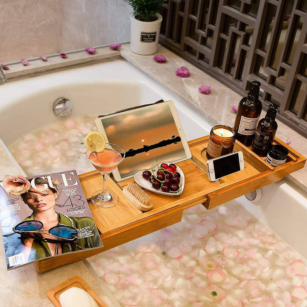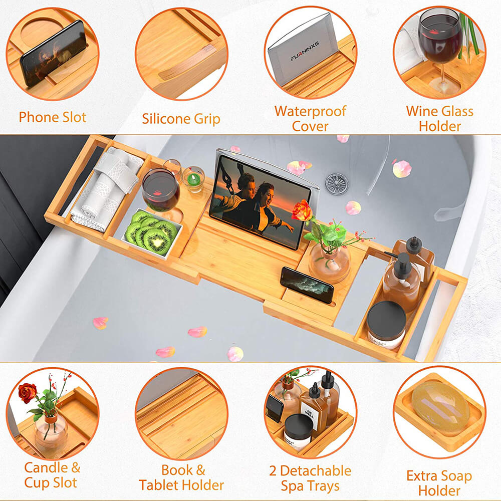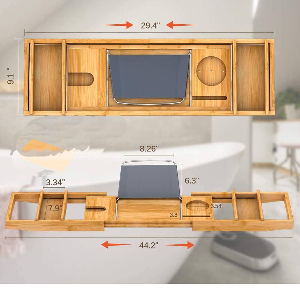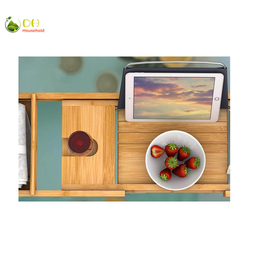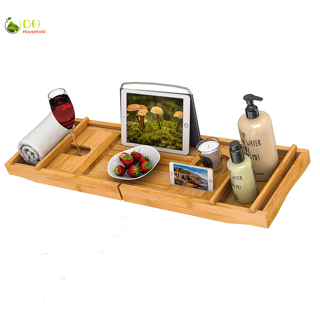 Name and description: | Expandable and Adjustable Bamboo Bathtub Caddy Tray for Luxury and Relaxing with Wine Glass Holder Reading Rack Donghe DHB01008 |